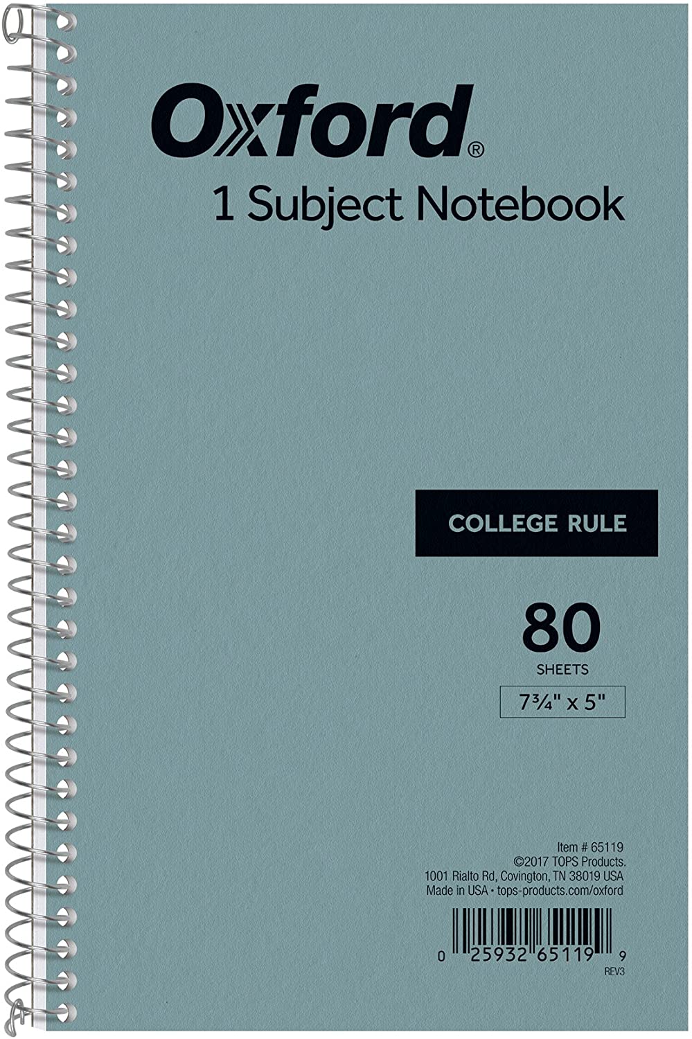 Oxford 1-Subject Pressboard Notebooks have a durable, thick cover to survive heavy use. A sturdy, snag-resistant coil resists catching on backpacks, papers or clothing. Proudly made in the USA. 5" x 7-3/4". Blue cover. College ruled, 80 sheets.